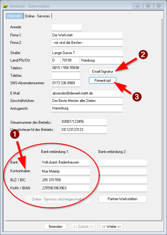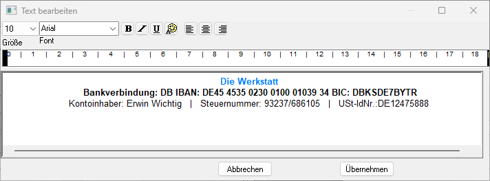 Unter Stammdaten →  Werkstattstammdaten kann der Name des Kontoinhabers für ggf. zwei Konten hinterlegt werden. Diese wird beim Versand von X-Rechnungen automatisch verwendet.