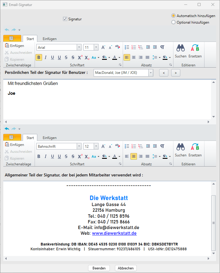 In diesem Dialog lässt sich auch die EMail-Signatur ggf. um einen Eintrag zum Kontoinhaber bearbeiten. Nach einem Klick auf EMail-Signatur wird der aus anderen EMail-Programmen bekannte Dialog zum Eingeben von persönlichen und allgemein gültigen Signaturen angezeigt: