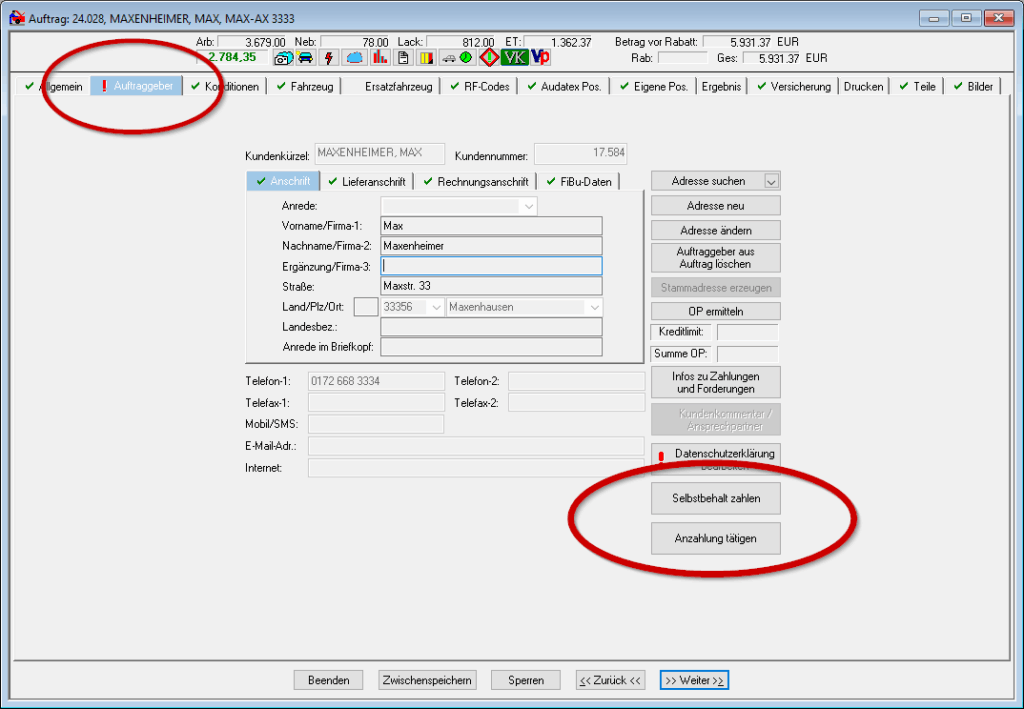 Im C@risma kann ein Selbstbehalt oder/und eine Anzahlung im Auftrag schnell erfasst werden. Dazu wird auf den Reiter Auftraggeber gewechselt und im Fenster unten rechts sind die beiden Menüpunkte dazu vorhanden: